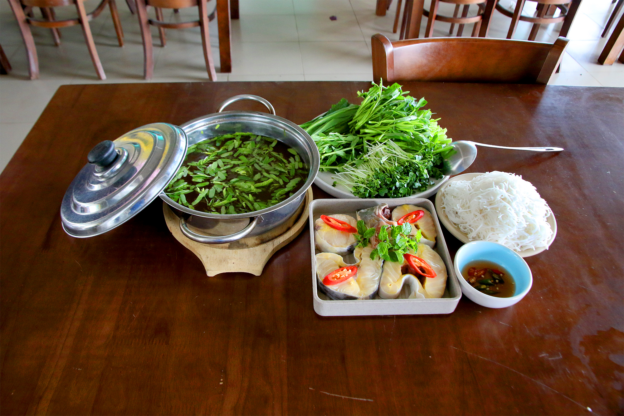 Cá tầm tươi sống, được tuyển chọn kỹ lưỡng từ nguồn cá tươi, giữ trọn vị ngọt thanh và độ săn chắc tự nhiên. Khi thả vào nồi nước lẩu lá me chua nhẹ, vị cá hòa quyện tinh tế với hương lá me thanh mát, tạo nên bản giao hòa trọn vẹn giữa chua dịu – ngọt nhẹ – đậm đà khó quên. Ăn kèm cùng rau xanh và bún tươi, từng gắp đều khiến vị giác bừng nở và tròn đầy cảm xúc.